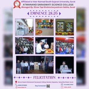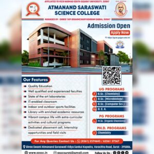 Atmanand Saraswati Science College was established in August 2018 by Shree Tapi Brahmcharyashram Sabha. The college is affiliated with Veer Narmad South Gujarat University. Shree Tapi Brahmcharyashram Sabha was founded in 1924 by Shree Swami Atmanand Saraswati, a great social reformer and educationalist. The members of the trust are people with deep interest in and commitment to developing state-of-the-art infrastructure for educational pursuits.